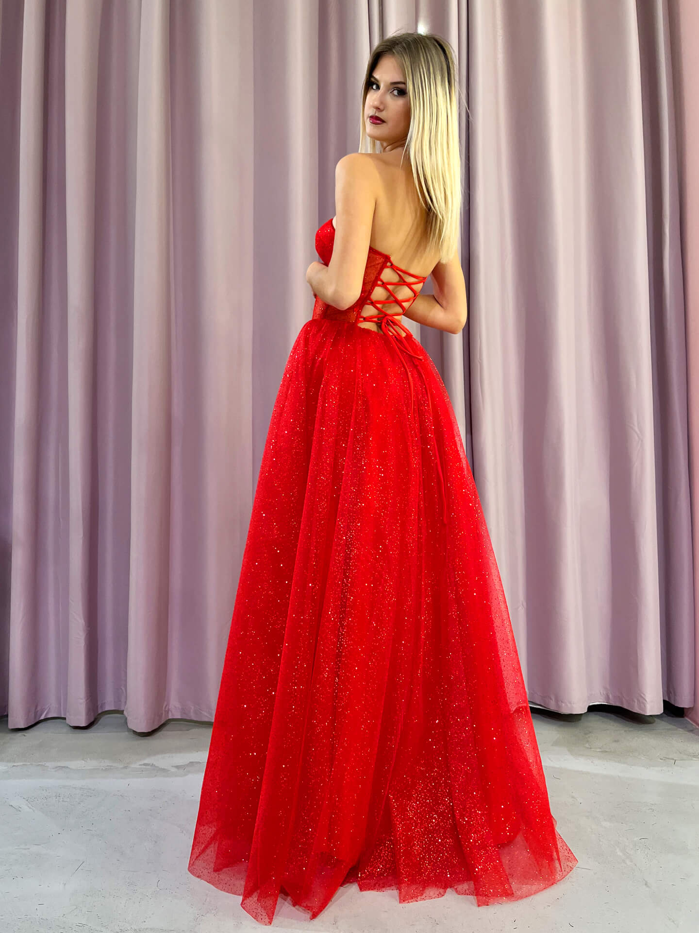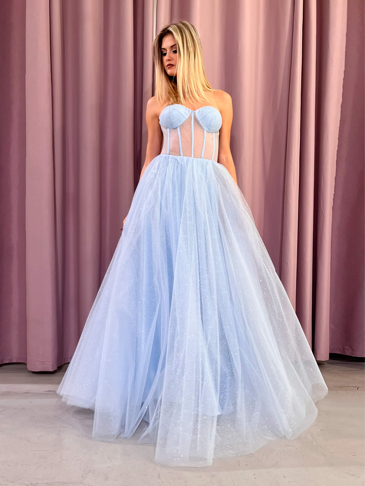 Scopri il nostro abito Egle, un modello bustier in tessuto glitterato. L’abito Egle è un’autentica dichiarazione di eleganza e grazia. Questo abito è progettato per farti sentire come una vera regina nelle occasioni più speciali della tua vita. Il tulle leggero e fluido crea una silhouette voluminosa e affascinante, mentre le balze donano movimento e dinamismo.