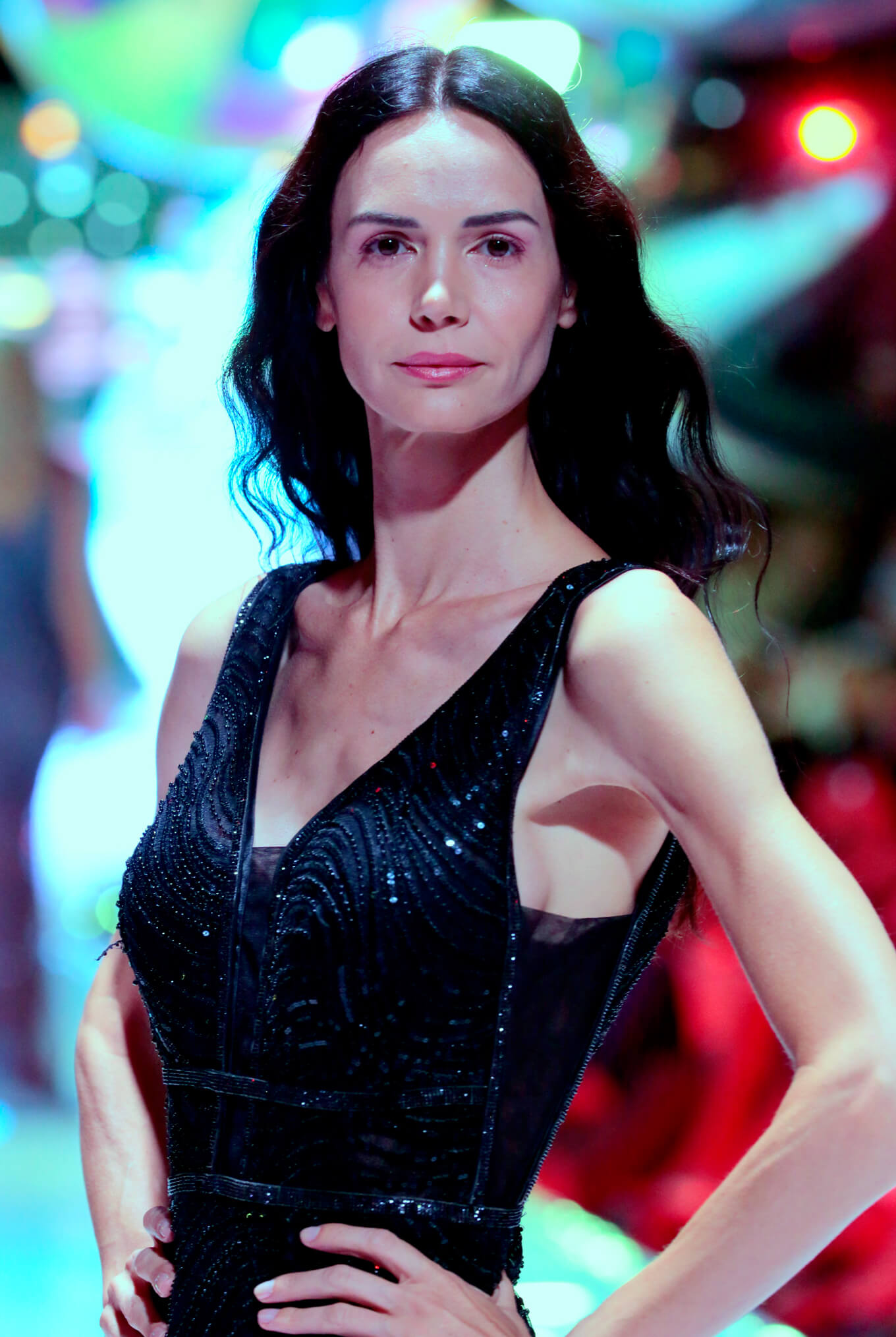 Realizzato in un prezioso tessuto nero luminoso, è caratterizzato da una linea longilinea e aderente che accarezza la silhouette valorizzandone le forme in modo naturale. Il profondo scollo a V sul davanti slancia il busto e dona un’allure sensuale ma estremamente raffinata, ideale per occasioni formali ed eventi serali di prestigio.