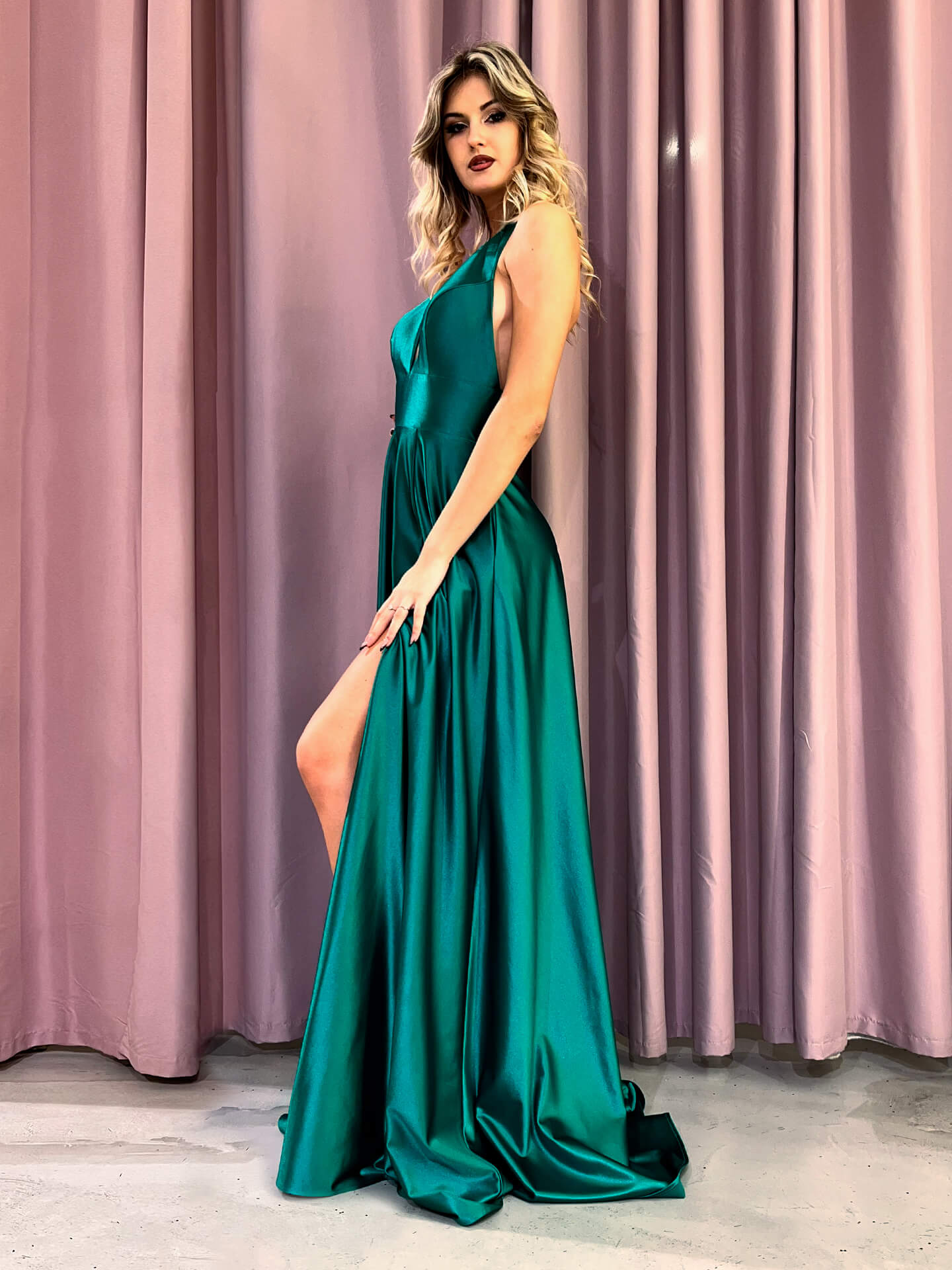 Realizzato in un tessuto satinato morbido e luminoso, avvolge la silhouette con grazia, valorizzando ogni movimento. La profonda scollatura a V aggiunge un tocco di audacia, mentre le spalline sottili donano leggerezza e raffinatezza. La gonna ampia e fluida cade armoniosamente, creando un effetto incantevole a ogni passo, e lo spacco laterale esalta la femminilità con classe e seduzione. Perfetto per cerimonie, serate di gala ed eventi speciali, l’abito Tecla è pensato per chi ama distinguersi con stile. Disponibile in diverse taglie e colori, è il capo ideale per sentirsi protagonista in ogni occasione.